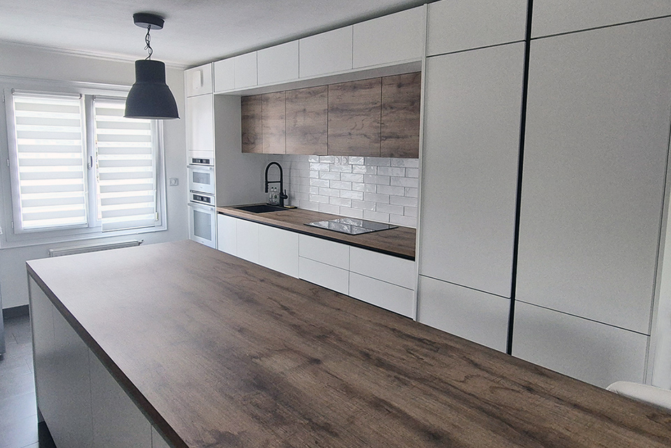 MATÉRIAUX UTILISÉS : FAÇADES EN LAQUE FINITION BRILLANTE, SUR MDF ÉPAISSEUR 22 MM ET PLAN DE TRAVAIL EN STRATIFIÉ